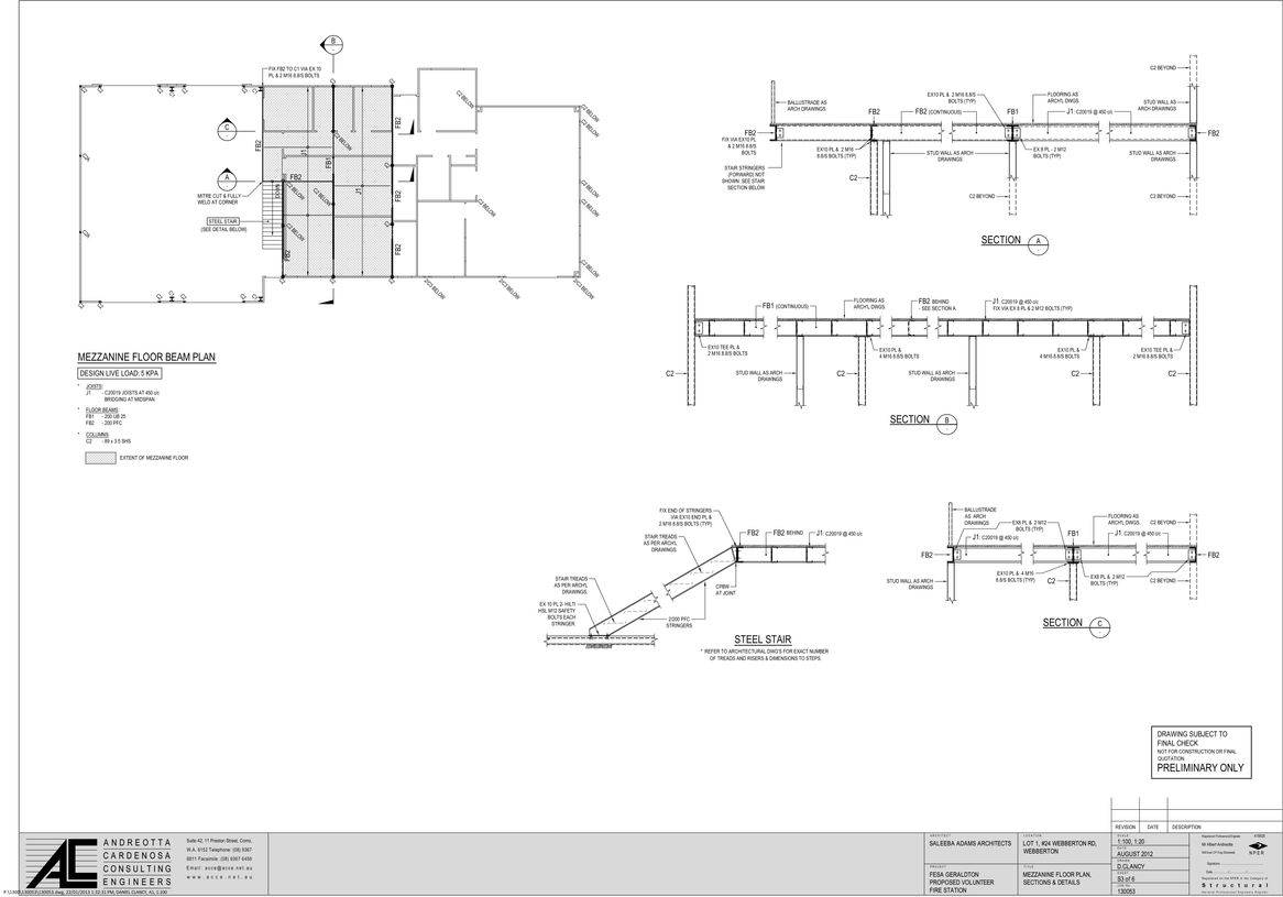 A detailed structural engineering documentation package for the Geraldton Fire Station including mezzanine beam plans roof framing layouts pad footings structural bracing block screen walls and various roof and slab connection details. The drawings include structural notes design loads steelwork details flybrace arrangements bracing specifications and cross sections required for new works and retrofits.
